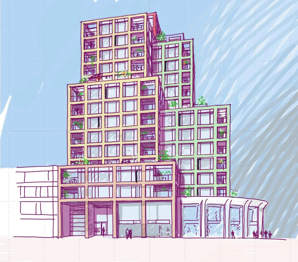 The next series is about affordable housing over the last thirty years of Rietveld Architects New York. This building is part of the central shopping district of Tilburg, and knew many different design iterations. This is the one that had to look more like a bouquet of flowers.