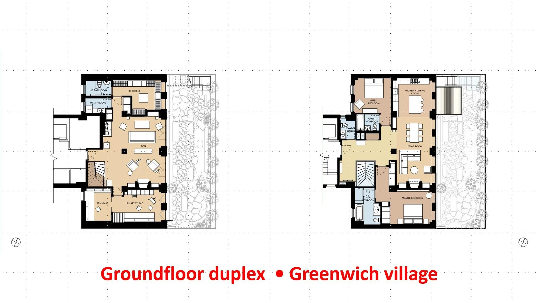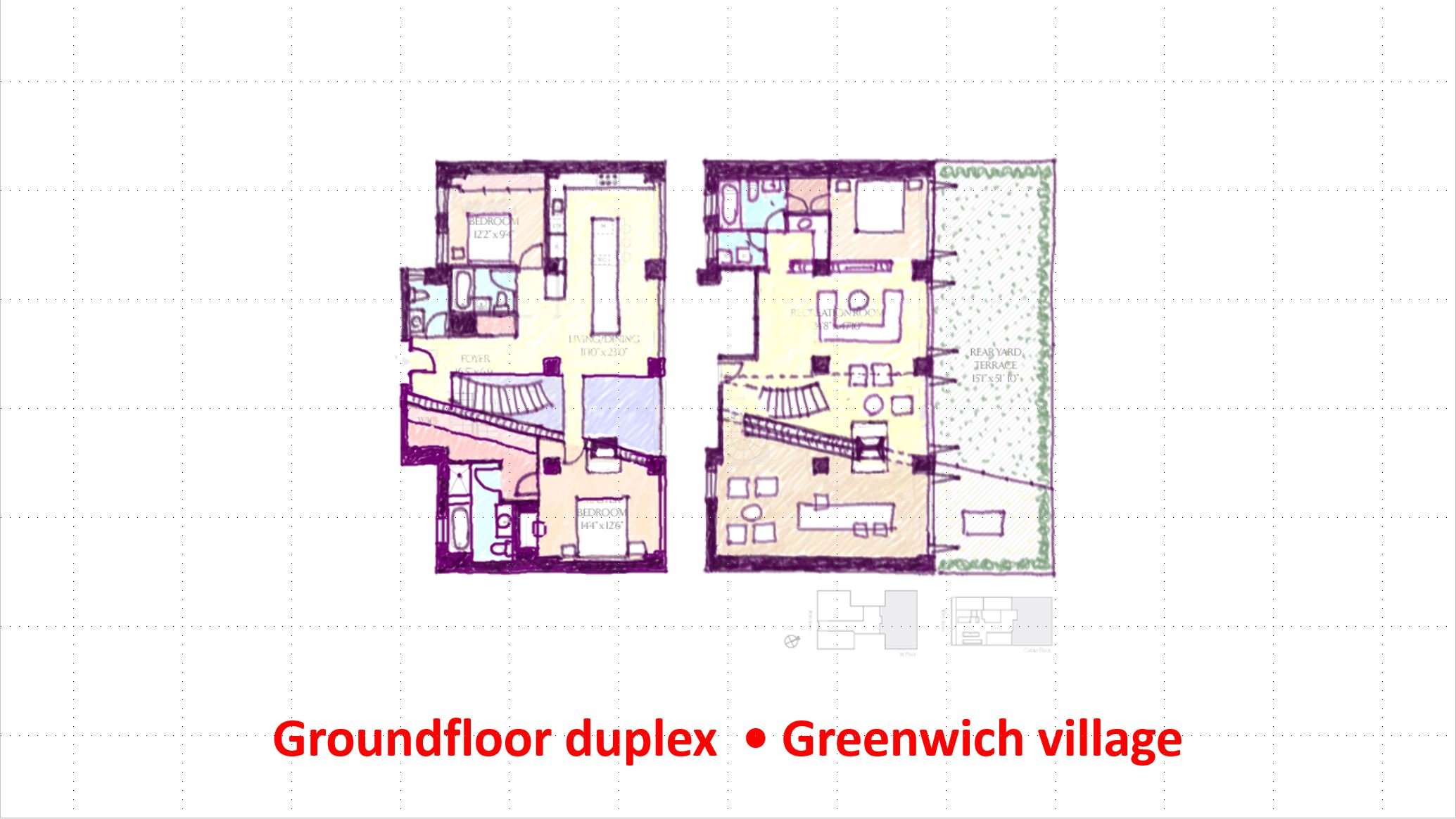 In a new series of posted floorplans, we'll divide them in different categories. We start with duplex apartments. Greenwich Village ground floor and garden floor duplex. Opening the ground floor to below with a double height window in the facade could not be done, so that shuffled the program around...2