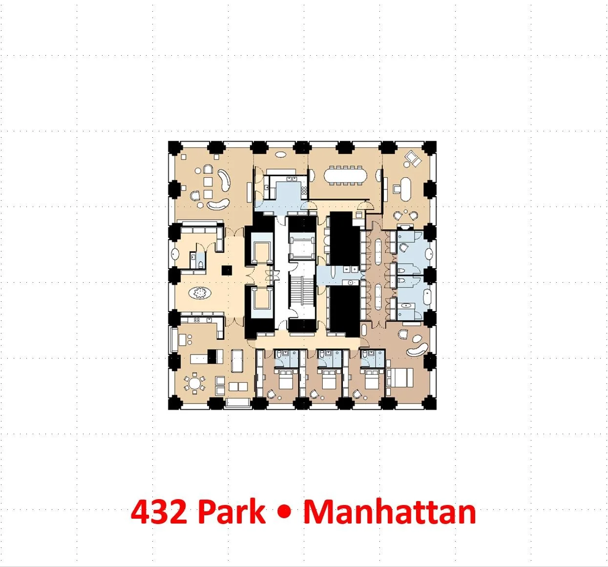 In the series Single floor apartments: 432 Park. My favorite Super Tall. Originally the staff floor with 20 studios on the lowest residential floor. 34th floor. But these never sold well. For some time the floor was used as an office floor. A big puzzle to create a full floor apartment, because there were too many shafts. In the end our client couldn't purchase the floor for an amount that made sense for her. This is one, we would love to have done... 1